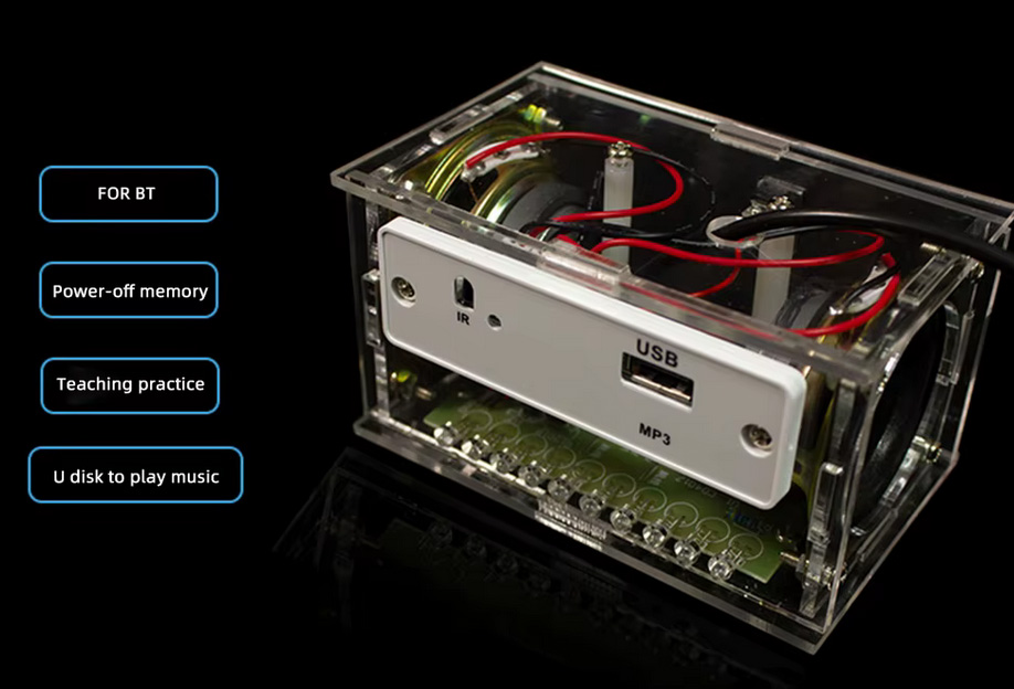 3. Інтерфейс джерела живлення 3,7-5 В постійного струму для автоматичного відтворення музики, стерео підсилювач, підтримка Bluetooth, підтримка пам'яті при вимкненні живлення.